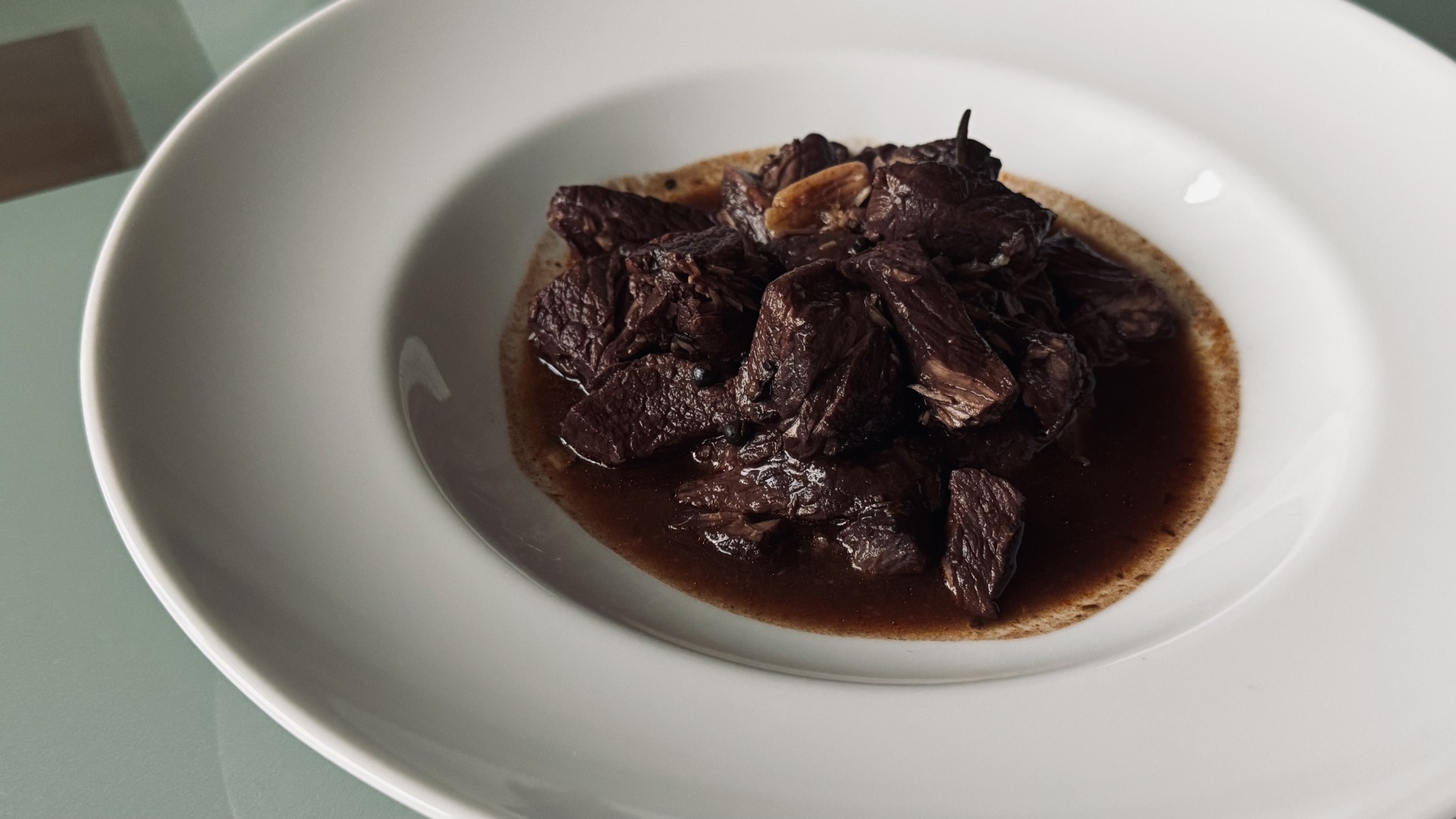 Da der Rotwein einen erheblichen Anteil in den Geschmack einbringt, ist es selbstverständlich, dass nur beste Qualität im Topf landet. Am besten genau der Wein, den man dazu auch trinken mag. Originalrezepte verlangen in der Regel nach Chianti. Klar, das Gericht stammt ursprünglich aus der Toskana, der Heimat des Chiantis. Ich erlaube mir auch hier eine Abweichung vom Original und entscheide mich stattdessen für einen Primitivo aus Apulien, der aktuell auf der Rotwein-Top-Ten-Liste ganz oben steht. Dicht, süffig, weich und mit viel dunkler Frucht – so präsentiert sich der Passo del Sud Primitivo IPG (Tagaro SLR, 2023), der diesem Gericht voll gerecht wird. Ich würde in jedem Fall gleich ein paar Flaschen extra kaufen. Gegen den „originalen“ Chianti wird wohl aber ebenfalls nichts einzuwenden sein.
