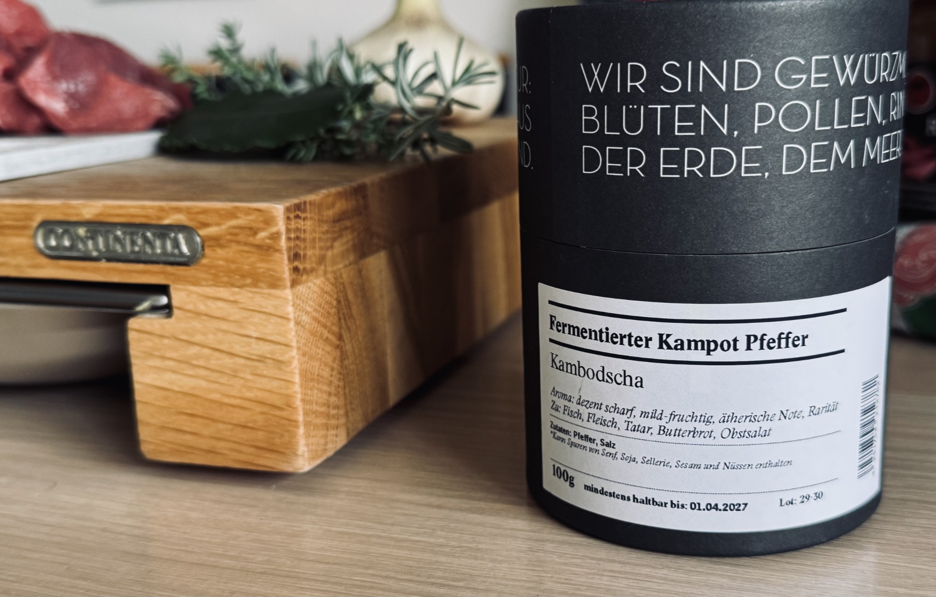 Die kulinarische Überraschung des Jahres für mich ist fermentierter schwarzer Pfeffer. Schon die ersten Versuche mit dem „Onyx Pfeffer“ aus Sri Lanka vom Gewürz- und Teehaus Schnorr in Frankfurt waren ein wahrer Wow-Effekt. Für fermentierten Pfeffer werden schwarze Pfefferkörner mit feuchtem Meersalz vermischt und fermentiert, wo bei sich ein wirklich unvergleichlicher Geschmack entwickelt. Wir haben den Onyx Pfeffer auf einem köstlichen Tomahawk-Steak vom Grill verkostet und waren begeistert. Für dieses Peposo habe ich dann einen Spontankauf während eines Ausflugs nach München verwendet: Fermentierten Kampot-Pfeffer aus Kambodscha von der Gewürzmühle Rosenheim. Die Struktur dieses Pfeffers ist etwas gröber als beim Onyx Pfeffer, weil die Pfefferbeeren im Ganzen verwendet werden. Das passt super in dieses Schmorgericht, während ich auf dem Steak von Grill eher den grob zerstoßenen Onyx von Schnorr verwenden würde. Man sollte einfach beide im Haus haben. Wer einmal fermentierten Pfeffer probiert hat, wird ihn auch nicht mehr missen wollen und viele eigene Verwendungen finden. So soll der Pfeffer z. B. einfach auf einem frischen Sauerteigbrot mit Butter ganz köstlich sein. Achtung: Der fermentierte Peffer kommt immer mit einem ordentlich Anteil an Salz, weshalb die Salzzugabe im Gericht reduziert werden muss! Und keine Angst vor der Schärfe: nach dem Fermentieren weist der Pfeffer eine frische Note auf, die viel milder ist, als in üblichen getrockneten Pfefferkörnern. Kann man gut auch mal pur probieren. Abgesehen davon spielt der Pfeffer (neben dem Wein, dazu unten mehr) hier nun mal die Hauptrolle und soll im Gericht am Ende deutlich präsent sein.