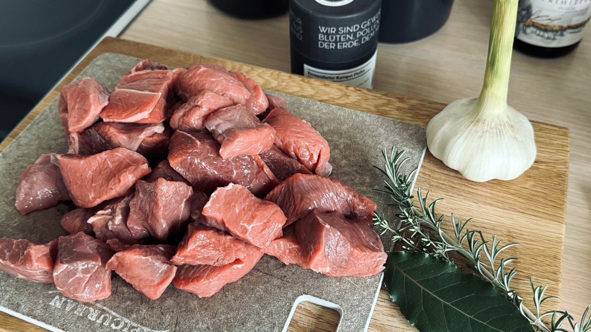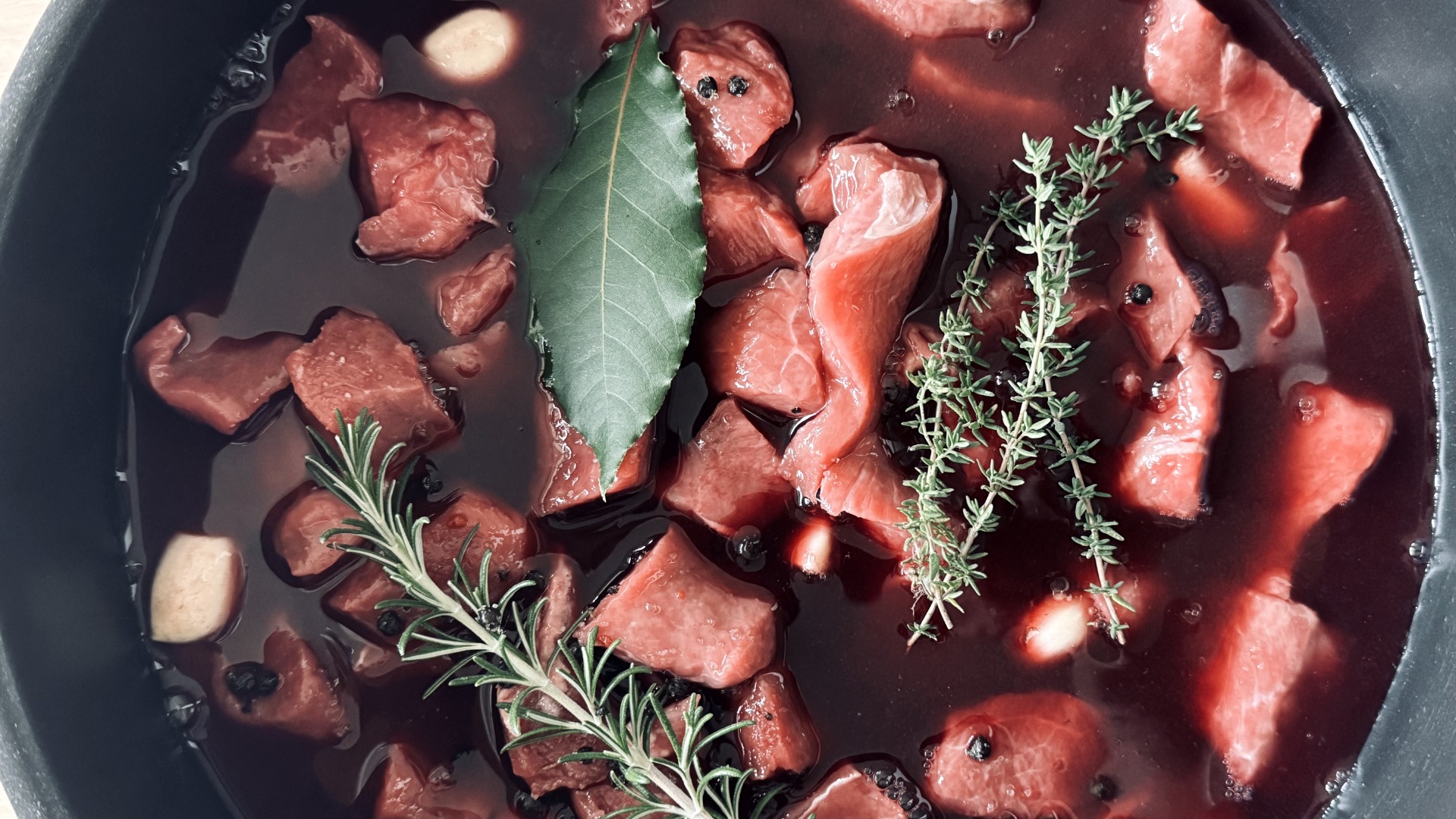 1. Rindfleischgulasch wenn nötig in gleichmäßige größere Stücke schneiden und direkt in einen großen Schmortopf geben und salzen. Rotwein angießen. 1 EL Tomatenmark in ca. 200 ml erwärmtem Rinderfond gut auflösen und in den Topf geben (der restliche Fond wird ggf. später angegossen). Hinzu kommen nun die geschälten Knoblauchzehen (im Ganzen), die Kräuter (ebenfalls im Ganzen) und ein schöner EL (!) vom fermentierten Pfeffer.